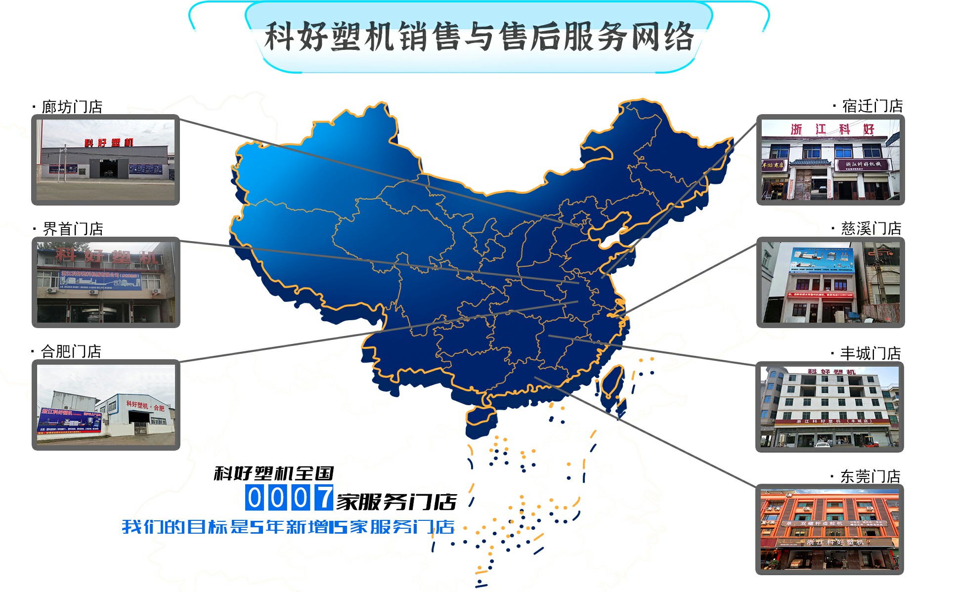 科好塑機先后創立了浙江慈溪門店,江蘇宿遷門店,江西豐城門店,安徽界首門店,廣東東莞門店、安徽合肥門店,河北廊坊門店全國7家服務門店。